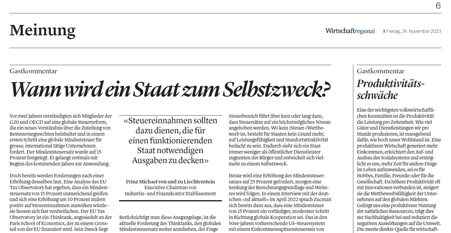 Berücksichtigt man diese Ausgangslage, ist die aktuelle Forderung des Thinktanks, den globalen Mindeststeuersatz weiter anzuheben, der Frage gegenüberzustellen, worin die eigentliche Funktion von Steuereinnahmen liegt? Grundsätzlich sollten Steuereinnahmen helfen, die für einen funktionierenden Staat notwendigen Ausgaben zu decken. Also jene Verpflichtungen, die es für eine funktionierende Gemeinschaft zwingend braucht, wie etwa Investitionen in die äussere Sicherheit, ein funktionierendes Rechtssystem oder das Bildungswesen. Nicht aber sollte es darum gehen, Steuereinnahmen grundsätzlich